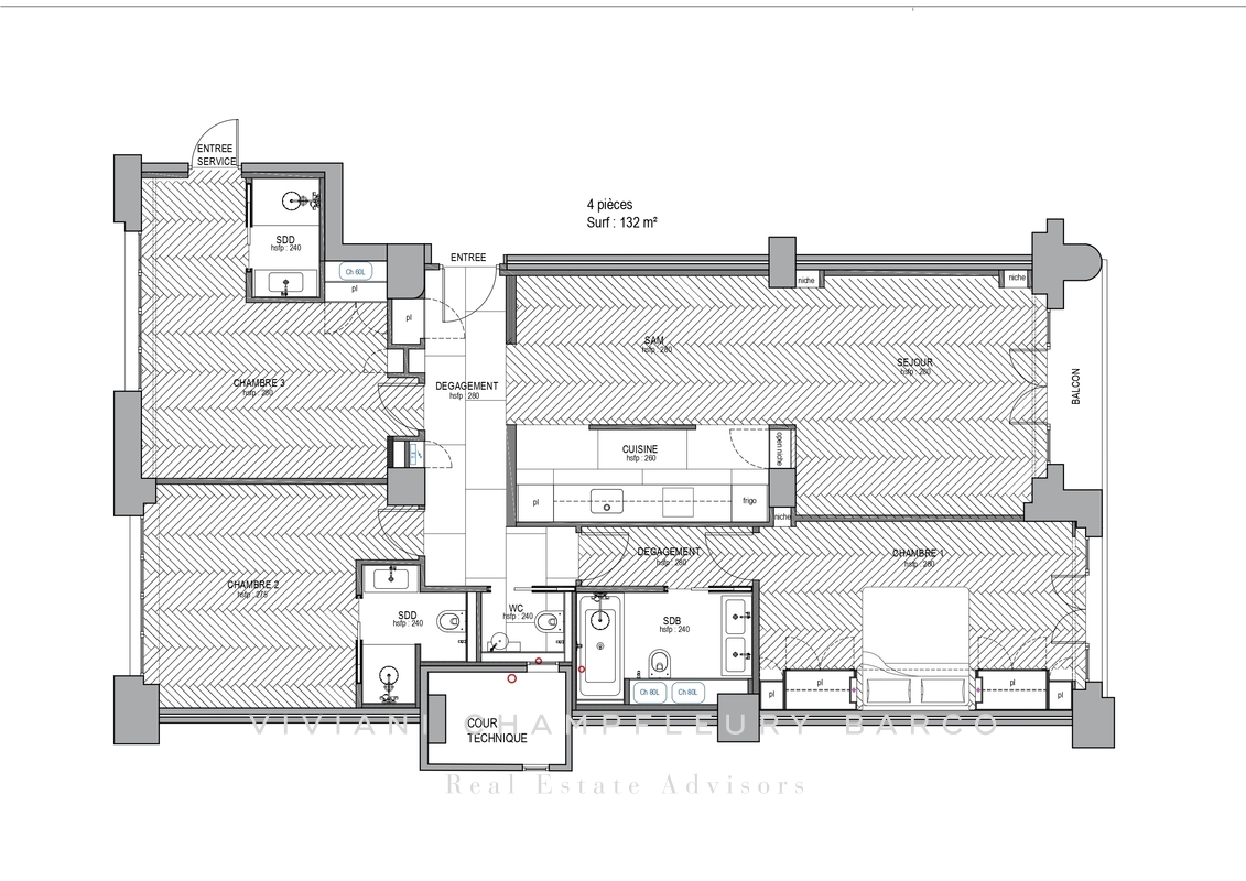 This spacious and bright 3-bedoom family apartment, with a generous 128 m², impresses with its elegant volumes. The living room, enhanced by a refined ceiling height, opens onto a balcony. A welcoming dining area and a semi-open, fully equipped kitchen with integrated appliances complete this refined living area.